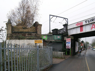 [13]  Walk along Elliot Rd and turn right into Bristol Rd. This is the worst part of Selly Oak’s high street, noisy, dirty and derelict, but it is not without interest as it contains the transport corridors - road, canal, railway - that drew trade to the area. Cross Dingle Road and continue past rough ground (rhs, with old sofas amongst the trees) and past the Birmingham Battery Offices on your left, draped with ivy (lhs 1870s, where sheet metals were battered into shape).