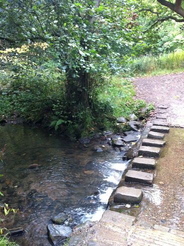 Go past the small workshop building on your left. Notice the steps to an upper level made of old grinding wheels. Cross the small bridge over the brook and turn left on to the wide tarmac path. Watch out for bikes and runners.