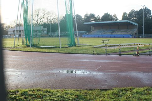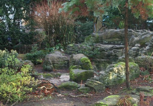 [4] Coming along Longford Road, or coming off the rough ground, you arrive at the sports ground. View though the railings. Several Olympic competitors have trained here. Go round the outside of the ground, and then straight on towards the trees. Here is a small pool and nature area. Keep straight on and then bear left by the rock garden, and then right to the pets corner.