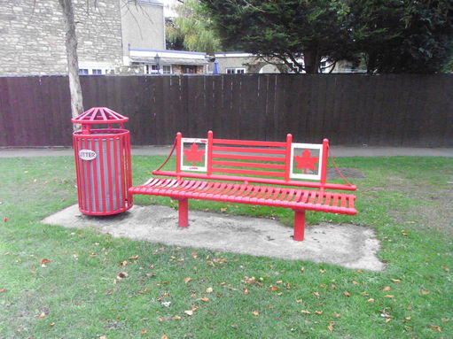 (A) The tree on the pavement island is where a Canadian pilot was killed in World War II. The nearby red seat is a memorial to him.