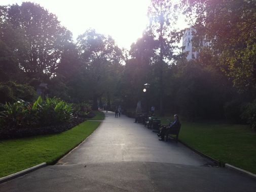 [10] Follow the main path through the gardens, past statues and water features. After a while there is a café on the left. Shortly after the café (and near the statue of the soldier on a camel), the path forks. For Charing Cross station, take the right hand fork and follow the path to reach the station entrance just outside the gardens to the right on Villiers Street. For Embankment tube, take the left fork and follow the path, leaving the park by the gate.