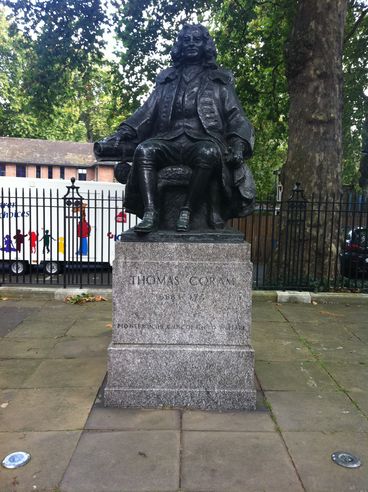 (B) At the end of Brunswick Square stands a statue of Thomas Coram (1668-1751), a sea captain and philanthropist, just in front of the Foundling Museum, which tells the story of the Foundling Hospital which Coram created as Britain's first home for abandoned children. The site of the former hospital itself is beyond in Coram’s fields (the entrance to which is passed later in the walk), where adults are not permitted to enter unless accompanied by a child under 16.