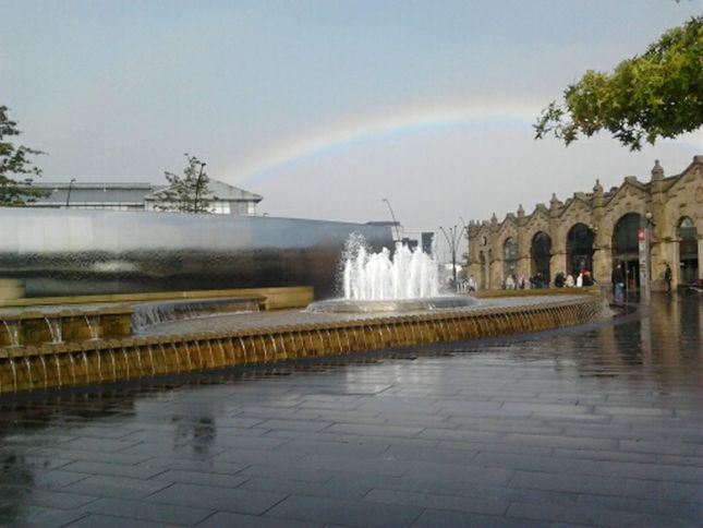 [1] From Meadowhall South / Tinsley supertram stop (SK397909), go right along the pavement, with Meadowhall centre to your left and the River Don to your right. Continue on the pavement, crossing a side road. Pass under a pedestrian footbridge, down a gentle slope, under two road bridges and then up a gentle incline. Pass under a footbridge between Meadowhall and the Transport Interchange. Continue along the path beside the river, past two sets of steel bollards. On the left, is an entrance to Meadowhall.
