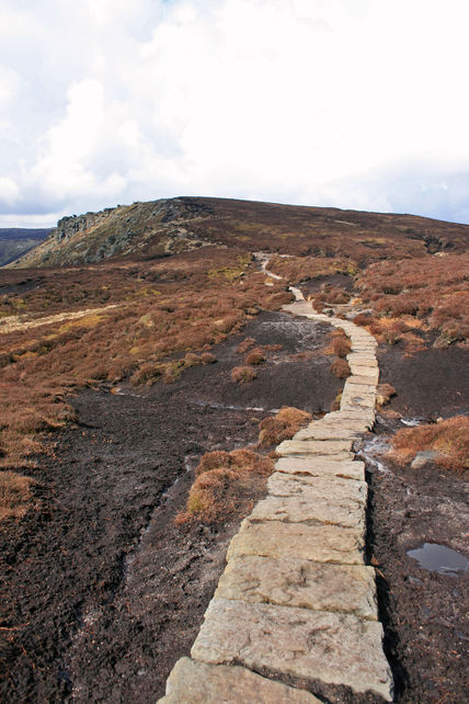 Continue past Pym Chair and Noe Stool on a route partly paved across the fragile peat. Approaching the low summit of Swine’s Back (SK079863), turn right at a large cairn to join the Pennine Way.