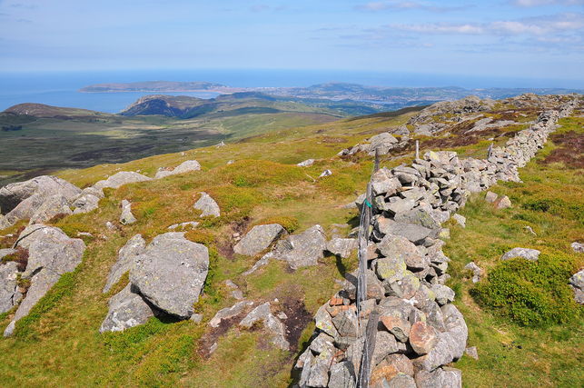 Then all exertions are forgotten; such modest effort for so-spectacular a reward. Clear days see the Isle of Man shimmering way out in the Irish Sea; closer to hand the coastal strip and much of Anglesey stand proud, with Puffin Island the near feature off Penmon. To the south and west rise some of Snowdonia’s giants, with the ridge of Drum taking the eye to the highest Carneddau and, farther south, Siabod and the Arans amongst countless peaks.