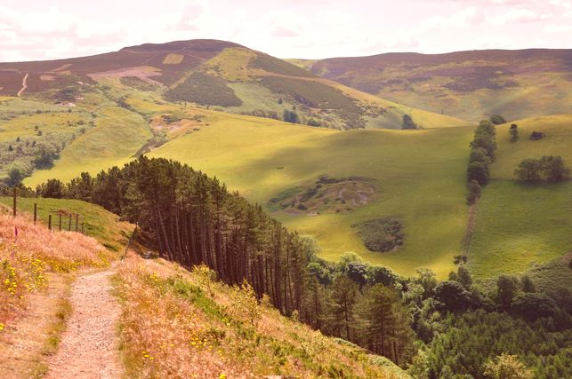 Simply follow the well-waymarked Offa's Dyke Path north along the gradually declining and shapely ridge of The Clwydian Hills, dropping to a stand of pines well above a hill-farm.