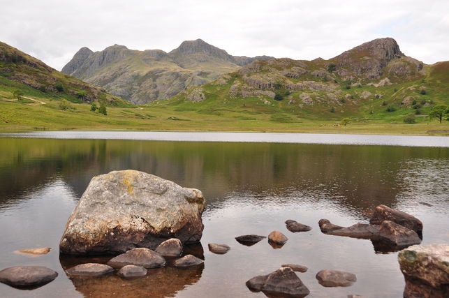 Pause a moment to ponder the magnificent, alpine-like view from the far end across this little tarn to the shapely Langdales.