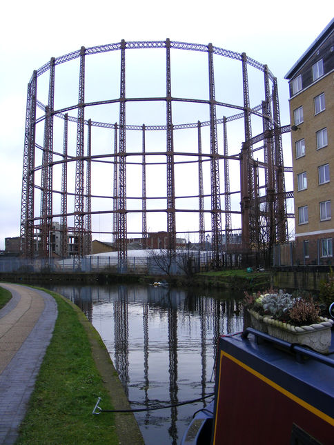 On the far side of the canal you can see the old Victorian Gas Holders. These were once a common sight in every town across the UK. They were originally used to store coal gas that was used in lighting London’s streets. Some were converted to natural gas in the 1960’s and some are still in use today
