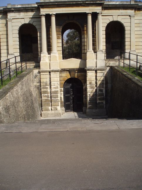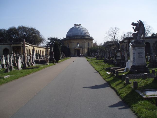 [3] Shortly after this turn left through the iron gates of Brompton Cemetery. Walk ahead past the first turning to the left. Turn left at the next turning, then right passing in front of the Chapel to the entrance. Turn right into the main walkway passing between the Colonnades.