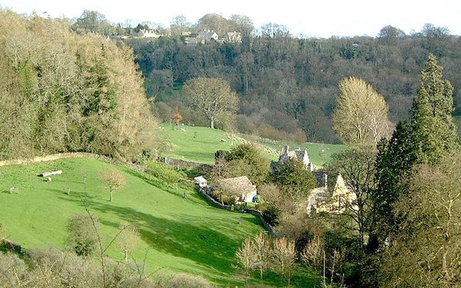 The walk continues along the road behind the pub, signposted Edgeworth and Miserden. Opposite the entrance to Daneway House look for a footpath sign on the left, pointing back left. Go over the stile and take the path that climbs up and round to the right, ignoring the lower path continuing ahead. Climb another stile, then a few yard ahead on the right, a third stile in a wire fence, beyond which the path climbs to trees. Once through the trees, you are in a meadow; go ahead to a stile on the right of a metal farm gate