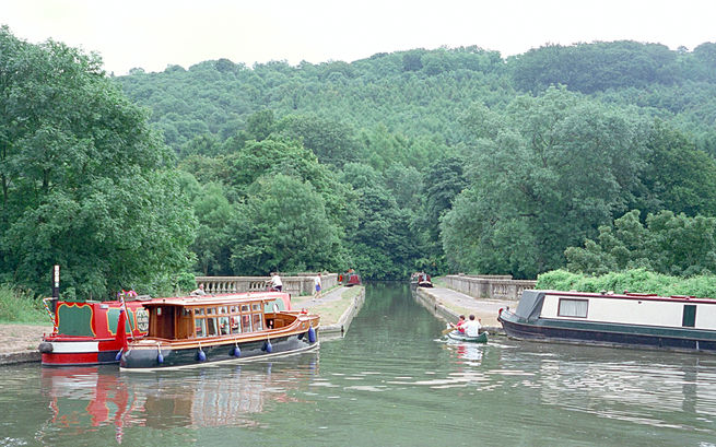 [4] Follow the canal towpath passing chandlery and café on the right and continue through the security gate to a sign directing you down to the right. Turn left on this path to reach the Kennet and Avon Canal by Dundas Wharf and the aqueduct, turning left briefly to view the entrance of the Coal Canal. Your route now takes you over the aqueduct crossing both the railway and the River Avon, and along the towpath for 1300 metres to reach the bridge at Limpley Stoke.