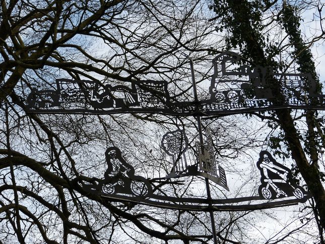 At the top of the steps, you come to the dramatic metal sculpture of a raven, one of four such posts along the route of the ‘Raven Walk’. As of Jan 2014, the sculpture is missing but the metal post that carried it is still there. Turn left here and follow a lovely path through the conifer woods, crossing streams by wooden footbridges and eventually climbing a stile into more open beech and oak woods; here, where sunlight filters through, bluebells carpet the ground in spring. Keep to the path until you reach a tarmac driveway, where you turn sharp right to reach the Activity Centre.