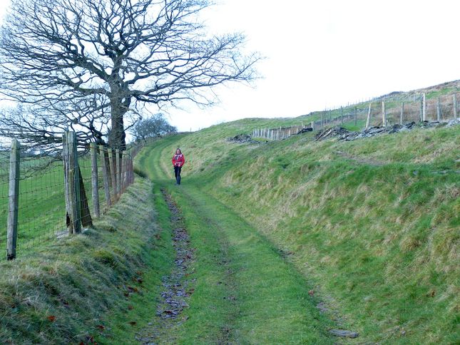 [2] Where the lane makes a sharp turn to the left opposite a metal field gate, take the stony track ahead, passing through a metal gate 200 metres further. As the gradient eases, you have fine views southwest across the valley to Caerphilly. Continue through a metal field gate whence the track runs between stone walls beneath a canopy of beech trees, losing height and soon meeting a broader track.