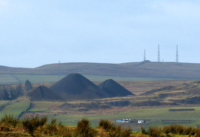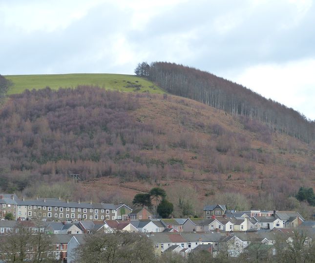 As you reach the trees, the track climbs up to the left to a broad junction; turn right to walk between the spoil tip on the left and the conifers on the right. When the tip is left behind, there are open views ahead and to the left where the conical waste heaps of the old Llanbradach colliery can be seen over three kilometres distant across the Rhymney Valley. Continue ahead across open country with a fence and wall to your right, heading for a radio mast on the skyline. The sport of fly-tipping, which is popular across much of south-east Wales is practiced regularly around here, it never ceases to amaze how far people will drive to dump a mattress or even a car!
