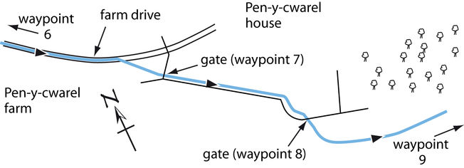 [6] Take this driveway, the name ‘Pen-y-cwarel’ is just discernible on the gatepost, passing farm buildings on your right, to reach a wooden gate and a house beyond. To the right by the wall, is a smaller gate, pass through this and go ahead, keeping close to the right-hand wall and respecting the privacy of the owners of the garden through which you are now walking. (Note that there have been issues with aggressive dogs running free in the garden.) When you reach a gate in the wall, go through to leave the garden, then look half-left for a little-used grassy track; take this, descending as the track bears left below the boundary of the garden and passing a rocky outcrop to reach a stile. Cross over and descend to a path where you turn right.