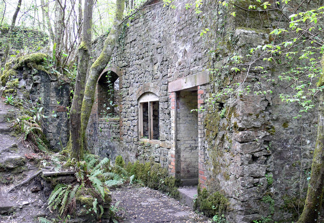 (C) The ironworks of James and John Fussell produced a vast array of tools for the agricultural industry, including scythes, reaphooks, spades, shovels and axes. They also manufactured water wheels, anvils, forges, hammers and bellows. The business was a large local employer and the tools produced were exported to the far corners of the Empire. The works closed about 100 years ago and now the site is reverting back to nature, but amongst the ruins, pits where the steel was forged, hearths and kilns, as well as lengths of rail track can be discovered.