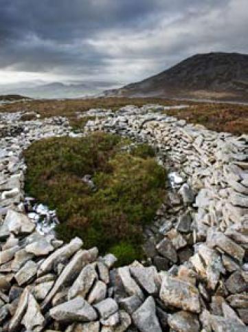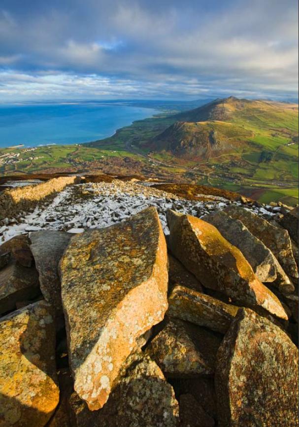 Yr Eifl is one among a dozen or so low hills, here known as carns, that carbuncle the face of the Lleyn. Jutting more than sixty kilometres/thirty-seven miles into the Irish Sea from the Cambrian Coast, the promontory feels more like an island than a peninsula: remote, exposed to the elements, and with a distinctive maritime light that is at its most magical on clear evenings, when the setting sun casts a red glow across the mountains of Snowdonia just inland.