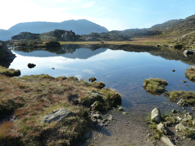 [3] At Dub's Hut, there is a broken slate path sharp left that drop down towards Warnscale Beck, now visible below. Turn right from this path to walk along a boggy path to the Beck and cross it using the stepping stones to access the clear path that rises on the opposite side. Follow this onwards as it climbs through the rocks ahead through a saddle pass and down the other side to pretty Blackbeck Tarn.