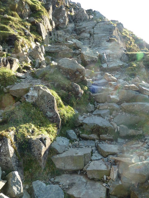 (C) The recently rediscovered crumbling nineteenth-century Honister Incline (tramline) amazingly, sliced across the middle of the 1000-foot crag and was used to reach the seam of high quality green slate that erupts from the hilltop. Three winding drums hauled the bogies of slate up and down the cliff, in places crossing dizzying voids on lengths of timber. It looks insane by the standards of modern engineering, but the Honister Incline ranked among the nineteenth-century slate industry’s most impressive technological achievements. The line, was only in use for thirty years. Howling gales, rock falls and icy conditions on Fleetwith Pike played havoc with the installations and made maintenance very expensive.