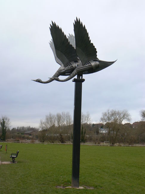 (B). On reaching a large grassy area known as The Ropewalk you will see a superb metal sculpture. This was made by the internationally renowned local sculptor, Walenty Pytel, and is entitled “Swans in Flight”. It is one of a pair of riverside sculptures, the other one being downstream towards Wilton Bridge.