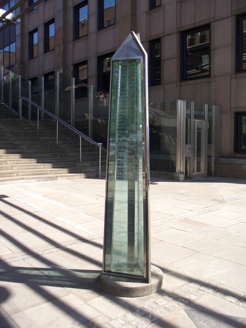 (N) The Millenium Measure is a glass and steel obelisk which measures 2000 years of religious, civic and scientific achievement. It was presented to the City of London in 2000 by the Worshipful Society of Scientific Instrument Makers to mark the millenium.