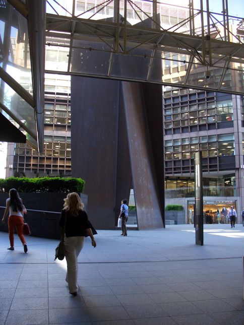 (A) 'Fulcrum' is a 55' high Corten steel sculpture created by Richard Serra in 1987. Serra (1939- ) is a minimalist sculptor known for his large scale steel structures.