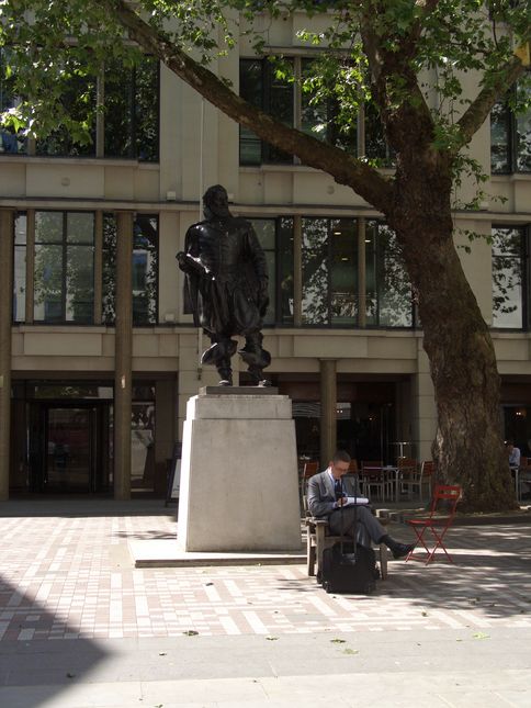 (F) A statue of Captain John Smith stands on a plinth in Bow Churchyard. The inscription identifies him as a Citizen and Cordwainer, 1580-1631, who was "first among the leaders of the settlement at Jamestown Virginia from which began the overseas expansion of the English-speaking peoples". The statue was presented to the Corporation of London by the Jamestown Foundation of the Commonwealth of Virginia in 1960, and is a replica by Charles Rennick of an original by William Couper made in 1907. Smith, a colonial adventurer, set sail from Blackwall to found the colony of Virginia in 1606. Following a period as the prisoner of the native Americans he became head of the settler's colony before returning to London in 1609-10. He was buried in St. Sepulchure's Holborn in 1631 where his gravestone can still be found.