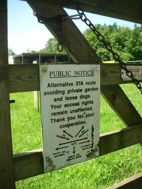 A previous owner made an informal diversion and, as the sign says, left the legal route open while encouraging people to use the diversion. As you can see, the legal route is now impassible. This represents the sort of dilemma that footpath workers sometimes face. On the one hand, the diversion is a minor one. On the other hand, the route on the ground now diverges from the route shown on maps and quite a lot of people get lost here. Consider what you might have done if you did not have this route guide. If you feel that this is a problem report it to the council. They say they will take action if enough people complain. If, however, you think that the problem is minor, let it go.
