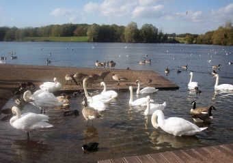 (A) Cosmeston Country Park contains two lakes created by flooding disused quarries and they attract large flocks of waterfowl which include impressive numbers of mute swans, mallards and diving birds such as the great crested grebe. Situated within the country park is a reconstructed 14th century medieval village which surrounds the remains of a medieval dovecote.