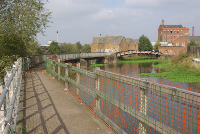 [7] After crossing a bridge over the weir, where the river and the canal meet, you come to a Lock. Leave the canal path at the Lock and join the road at Frog Island. Turn left onto this road and follow it for around 600m until you see the Aldi supermarke