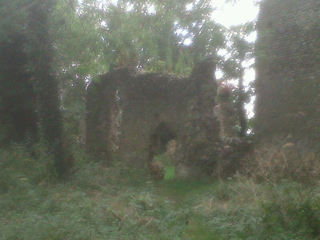 Turn right at the road keeping the memorial to your right take the track to the left at crossing take track to left to corner of woods the path to church on this corner
