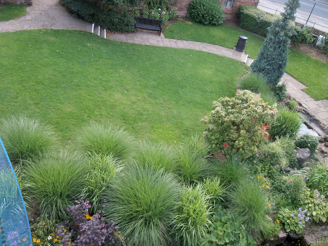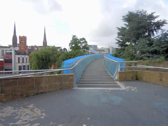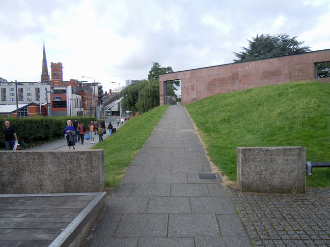 [2] Cross the side road on the right with care and follow the path through a small green space with benches. Continue through the underpass and follow the path in front of you which leads up a slope to a red stone architectural wall, and then follow the 'blue' sky-walkway, over Lady Herbert's Garden and part of the medieval city wall, until you arrive close to the entrance of The Coventry Transport Museum. (A) Lady Herbert's Garden was laid out in the 1930's by Sir Alfred Herbert in memory of his wife, Florence.