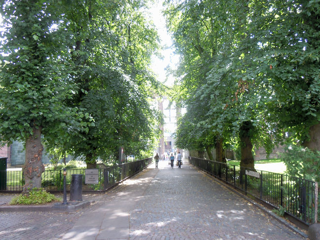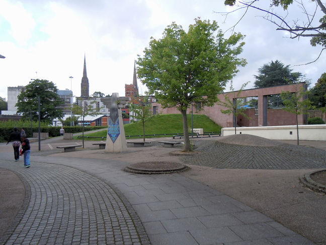 [4] Walk past Holy Trinity Church, and turn left. Walk up a cobbled path (with paving slabs for the use of push chairs and wheelchairs) with Holy Trinity Church on your left. When you reach the end of the Church head down St Michael's Avenue between the old Cathedral on the right and the new Cathedral on the left. You will see Coventry University directly in front of you. Before the entrance of the new Coventry Cathedral, there are toilet facilities discretely positioned on the right hand side. They are open from 9.00am to 4.45pm - tokens are available from the reception desk in the Cathedral. If you have time, enjoy a visit to the Cathedral. You may wish to descend the steps just after passing the Cathedral entrance, otherwise, take the path on the right hand side of the steps.