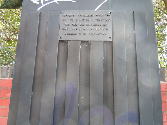 (A) Just before you reach Electric Wharf and the new foot-bridge, you will see a black marker on the right hand side of the tow path. It refers to the remaining part of the old Daimler factory that made the first British production car in 1897.