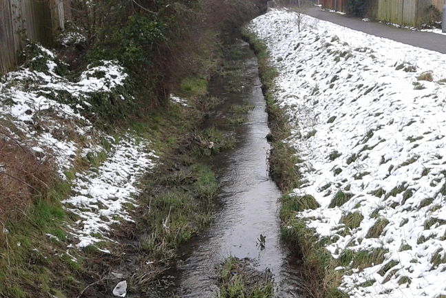 [9] Turn right onto the tarmac path and continue along it, with a stream on your left. Soon after passing houses on your right you will reach Butely Road.