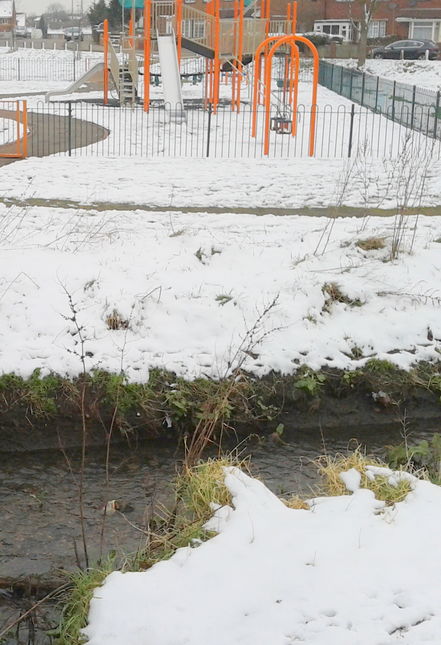 [14]  Just past Teesdale, there is a pedestrian crossing point to cross Actoworth Crescent, towards a small open green space. Cross here and turn right for a few steps until you pass a stream and reach a footpath on your left. Take this footpath as it follows the stream around the children's play area. (Caution: Take care walking close to the stream).
