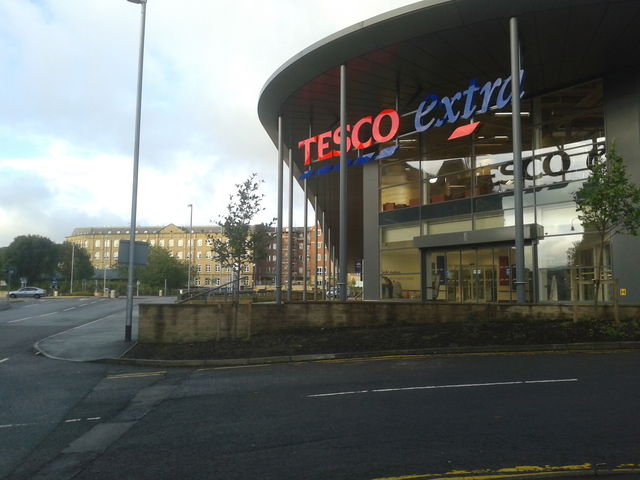 [8] At the station follow the path round the Tesco Superstore keeping under the outside cover till you reach the second entrance opposite the roundabout.