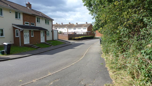 [5] Just after passing through the subway, where the cycle path goes to the right, take a footpath on the left, with some houses on the left and a narrow wooded area on the right.. Refer to photograph and take care not to miss this path. Continue along the footpath until it merges with a road and follow this road to a T junction.