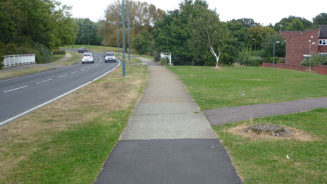 [3] Watch for a path on the right, just before some railings on each side of Southern Way. Go right on this path to cross the grass and reach a cycle track. Turn left onto this track.