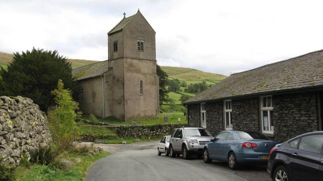[1] Kentmere Church stands at the top of a steep rise in the road near to the start of the Garburn Pass. From the church, follow the tarmac road to Nook House, which is situated at the foot of the pass; do not turn left but keep straight on through a gate. The lane twists below a series of crags and continues towards the head of the valley. Pass over a cattle grid, and soon the whole valley head comes into sight. The way continues, and at Hartrigg, leave the tarmac lane and take the left hand track through a gate. This track overlooks the farm which nestles in the conifers. Continue along this track, which after crossing a stream makes its way through the disused quarries. Keeping to the left of the river, follow the main path towards the reservoir. Cross the overflow channel via the footbridge and walk beside the overflow channel up to the dam.