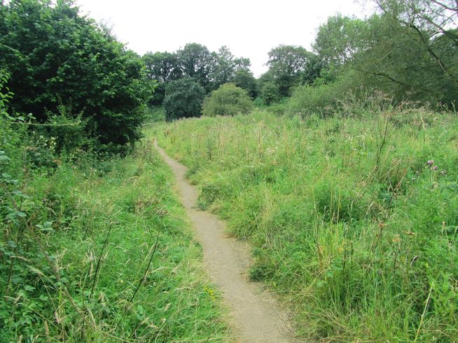 [3] Opposite Bruntingthorpe Way turn left along a pavement by a row of houses (numbered 24 - 34). Where the pavement turns sharp right, instead turn left following the 'Sowe Valley Footpath' waymarker. You will soon see the River Sowe on your right. Continue on the path, with a metal fence and school grounds on your left and the river on your right, to emerge into a large field. Here go left along two sides of the field to arrive at another 'Sowe Valley Footpath' waymarker, pointing the way you have just come. The field could be a little squelchy underfoot . To avoid this turn right when you enter the field and walk the other way round with the edge on your right to arrive at the same waymarker.