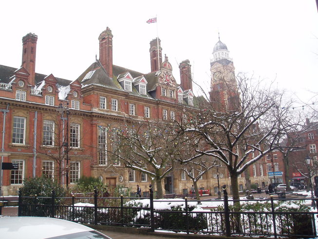 [12] After Bowling Green Street on the right you will see the Town Hall, which dates from 1875. After this is Town Hall Square with its fountain. Cross the square diagonally, going past the fountain then turn left onto Bishop Street.