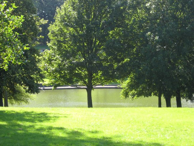 [5] Take the middle path which gently slopes downhill with the lake on your left. At the end of the lake before the raised mound that was the site of the old bandstand take the path that bears right towards the tennis courts