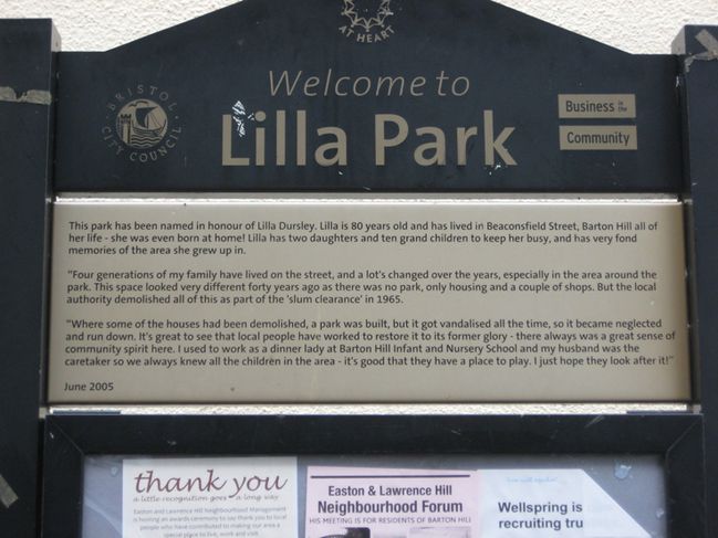 B. Lilla's Park - This park was named after Lilla Dursley who has lived in Beaconsfield St, Barton Hill all her life.  She was 80 at the time the park was named in June 2005.  There is more about Lilla on a sign in the park.  Unlike most Bristol parks this one is not managed by Bristol  City Council's Parks department but by their Estate Management (Housing) department.