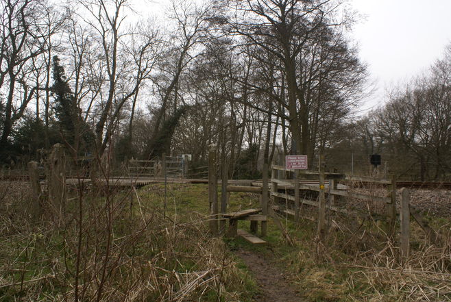 [2] Soon you will come to a small paved lane on your left, in a wood, with a sign to Worth Farm. Turn down this lane (Worth Lane) and walk for about 400 metres. The woods then end and you come to a bend with a gap in the hedge. Go past this, and after 20 metres or so more, come to another gap in the hedge on the left (opposite a broken footpath sign). You want to go left i.e. due west, walking at roughly 90 degrees from the lane.The path is not always clear across this field If in doubt walk straight across the field aiming for the telegraph pole ahead. Then bear left and immediately right following the edge of the field. After about 100 yards bear right to the railway crossing point which will now be visible.