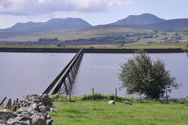 [6] Keep ahead to the red-roofed barn, slipping left before this over a footbridge then along the marshy track to a lane. Go right, eventually reaching the reservoir road beyond a farm. Turn right, then recross the footbridge back to Trawsfynydd.