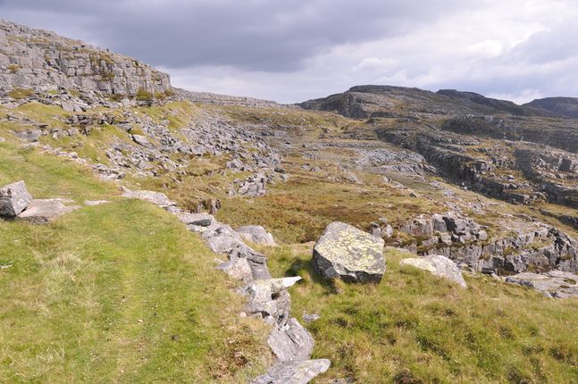 [5] The thin path plunges down a boulder field. At its foot, turn right alongside the wall. The going is difficult, with gulleys and drops, take care. At the old sheepfold, slip through the wall and turn left beside the nearby cross-wall. Cross this at the first opportunity (over a boulder in 150m), then walk the reedy, boggy path across several ladder-stiles and side-streams to reach the abandoned cottage, complete with rusty waterwheel.