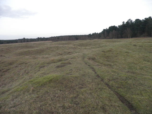 [3] Having visiting the castle and church continue along the road to Home Farm. The path turns right and left in the farmyard and in 250 yards bears right at a T-junction to pass by a house. Where the path meets the wood turn right and at the end of the wood turn left. Almost immediately the path forks by two oak trees. Take the right fork and follow the path for half a mile to the end of a wood on the right. Turn left towards Brickkiln Farm. Follow the path, through Emily’s Wood to the A1065. Cross the road and take the forest path opposite. Follow this gravel path through the forest for a mile and a quarter. Where the path meets a cross path carry straight ahead onto a grass path which leads to the fence enclosing the Grimes Graves Area. To visit the Graves follow the perimeter fence to the left.