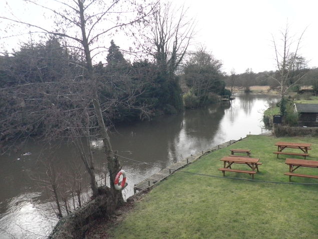 [4] The walk continues over a stile straight-ahead keeping the fence on the left. In 250 yards, where there is a gate, L, to the Graves, turn right. In 250 yards go over a stile, cross a gravel road and enter the woods. Follow the path through the wood, taking the left path at a fork and then turning right at a T junction and continuing over a track to meet the track alongside the railway. Turn left and follow the path through the bridge under the railway to the road ahead. Turn right onto the road and cross the river to return to the start.