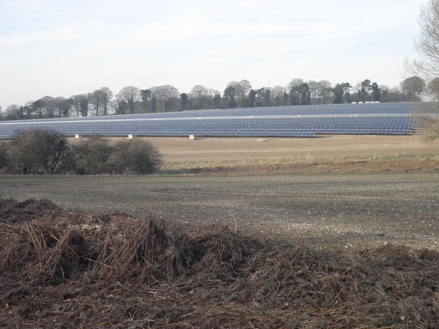 [3] The path goes through a mixture of wood and pasture until you reach a cross track with a derelict lorry trailer by it, with a wood to the right. Turn right along a farm track keeping the woods to the right. In 400 yards turn left along a path keeping the woods to the right. Follow this path for just over a mile to pass a pig farm on the left. Immediately after this at cross path turn left and head towards solar panel farm (currently being built-March 2013). Besides solar panels,follow path as it turns right up a slope and eventually meet a cross path with a path to an industrial site ahead.Turn left (there is a Public Bridleway sign in the hedge on the right).This is the Roman Road. Follow the road, now a firm farm track, for just over a mile crossing two roads. About 400 yards after the second road crossing, by a wood on the right, turn left along a wide track downhill between hedges.